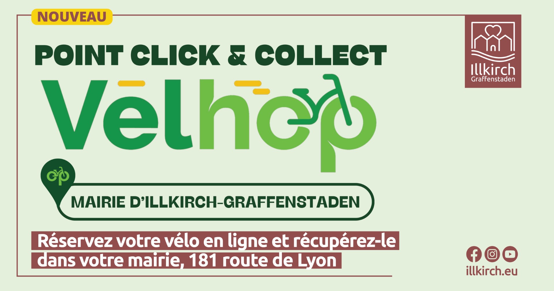 À partir du 3 février 2026, la mairie d’Illkirch-Graffenstaden devient un point Click & Collect Velhop. Ce nouveau service, simple et pratique, vous permet de réserver votre vélo en ligne puis de le récupérer directement à la mairie.